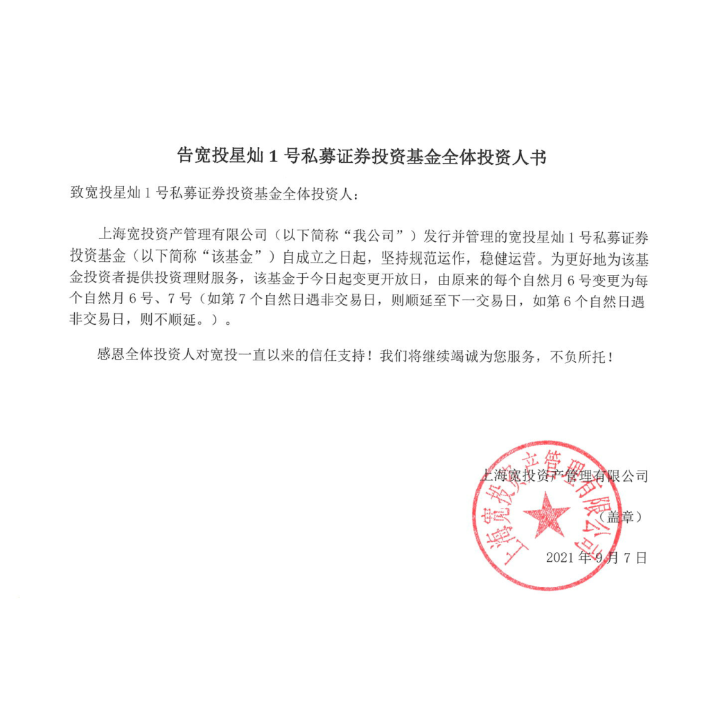 告寬投星燦1號私募證券投資基金全體投資人書